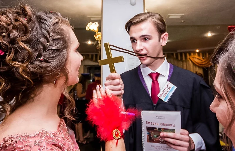 Квест на выпускной «Ночь в музее»: Иван Грозный царской рукой дарит милость, вручая всем своим оппонентам по фруктовому пирогу, что вызывает смешанные чувства от благодарных и испуганных гостей.